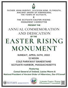 The Easter Rising Monument Committee invites all to attend the formal dedication of this beautiful tribute to freedom-lovers everywhere. The Easter Rising Monument is one of two stops in Scituate on the South Shore Irish Heritage Trail. Covid-19 restrictions prohibited a formal dedication of the Easter Rising Monument until now.